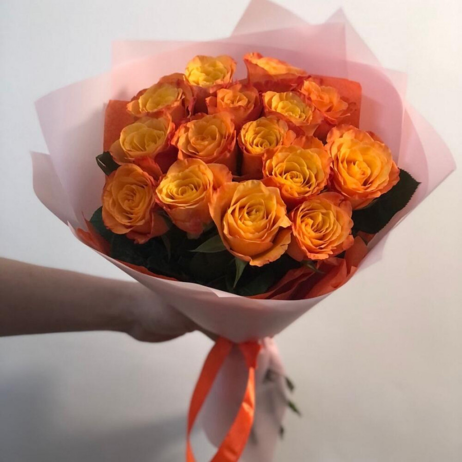 На фото 15 оранжевых роз. В составе: роза 15 шт, дизайнерская упаковка 2 шт, атласная лента 2 шт, . Все цветы свежие и ароматные, букет красиво оформлен и отлично подходит для подарка. Доступна доставка цветов или самовывоз.