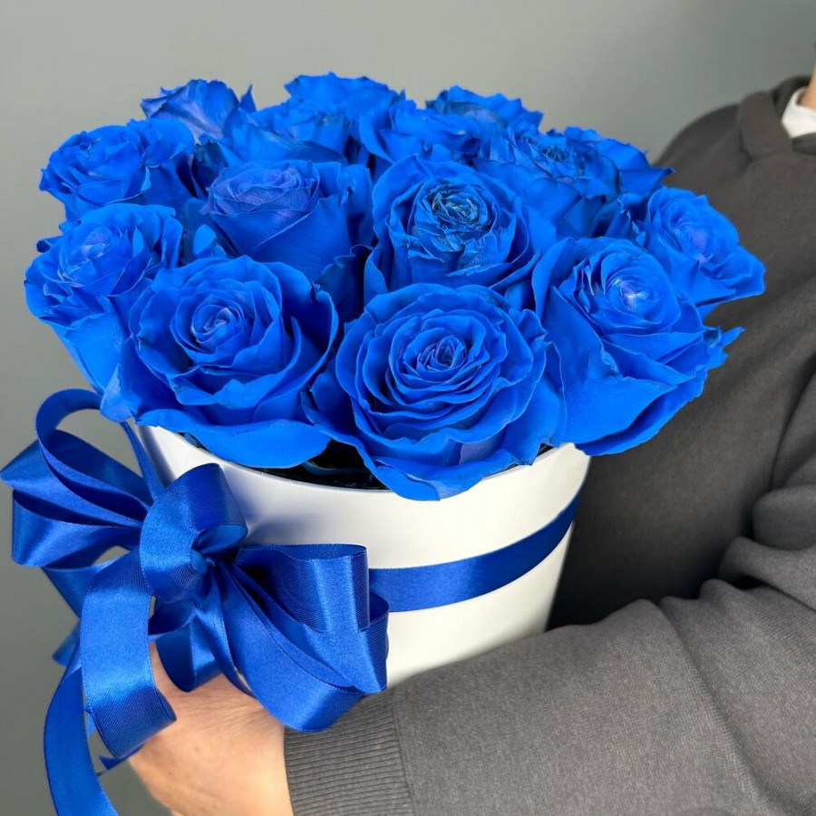 На фото монобукет из 15 синих роз в коробке «ночь и море». В составе: роза (синяя) 15 шт, шляпная коробка (s) 1 шт, атласная лента 2 шт, . Все цветы свежие и ароматные, букет красиво оформлен и отлично подходит для подарка. Доступна доставка цветов или самовывоз.