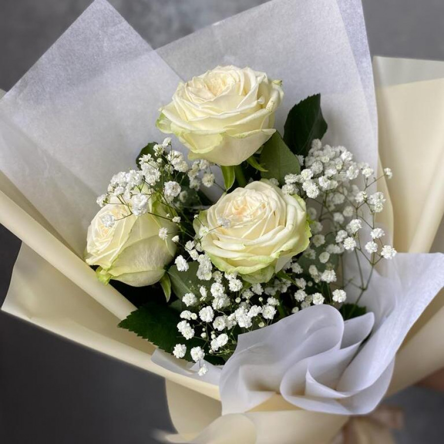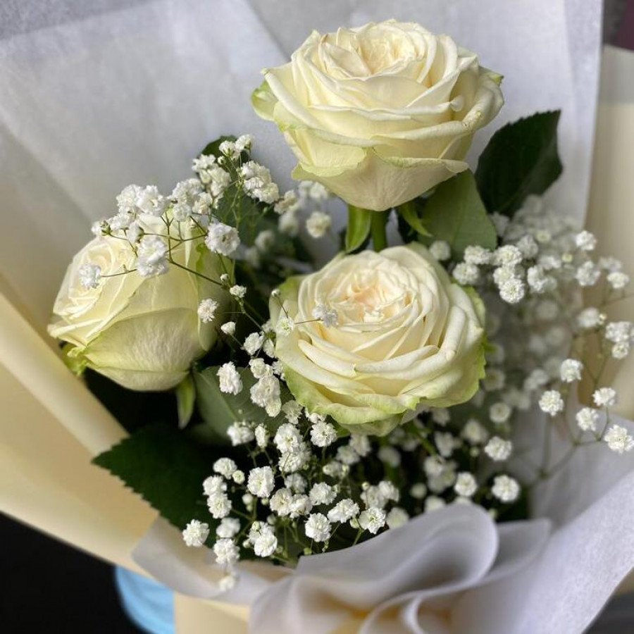 Букет из трех белых роз с белой гипсофилой - это идеальный выбор для тех, кто хочет выразить свои чувства и эмоции. Этот букет состоит из трех прекрасных белых роз, которые символизируют чистоту, нежность и любовь. Белая гипсофила добавляет букету воздушности и легкости, делая его еще более привлекательным. Такой букет станет прекрасным подарком на любой праздник или просто для того, чтобы порадовать близкого человека. Закажите букет из трех белых роз прямо сейчас, и он обязательно порадует получателя!